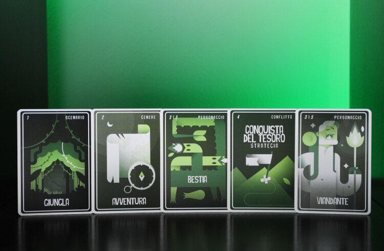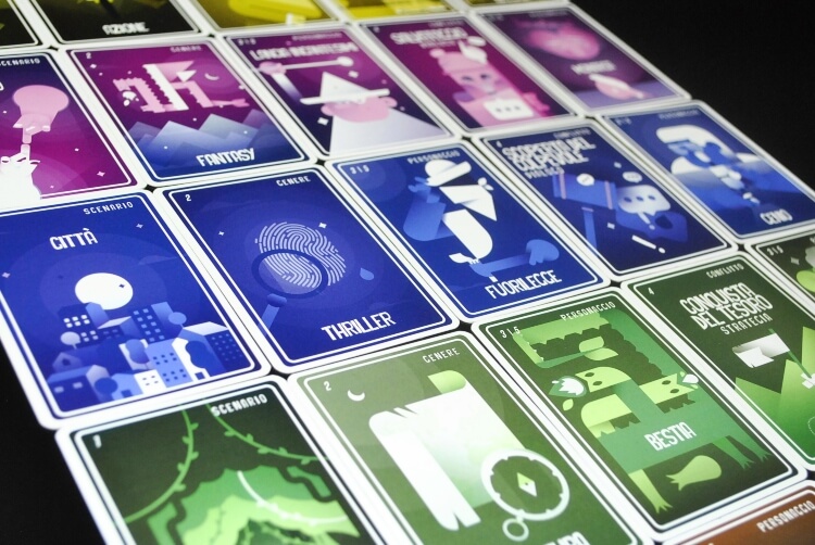 Nel raccontarla, man mano dovranno scartare le loro carte in ordine: dapprima lo scenario per dare un luogo alla loro storia, poi sarà il turno del genere che dovrà essere accompagnato dal tono di voce adatto (oscuro e tetro per l’horror, incalzante per l’azione ecc ecc…). In seguito toccherà al personaggio, il protagonista della loro storia, poi sarà il turno del motore vero e proprio del racconto, il conflitto, la prova che dovrà affrontare il nostro personaggio. Infine toccherà all’ultima carta personaggio che potrà essere un antagonista, un alleato, un passante o qualsiasi altra cosa vi suggerisca la vostra fantasia.