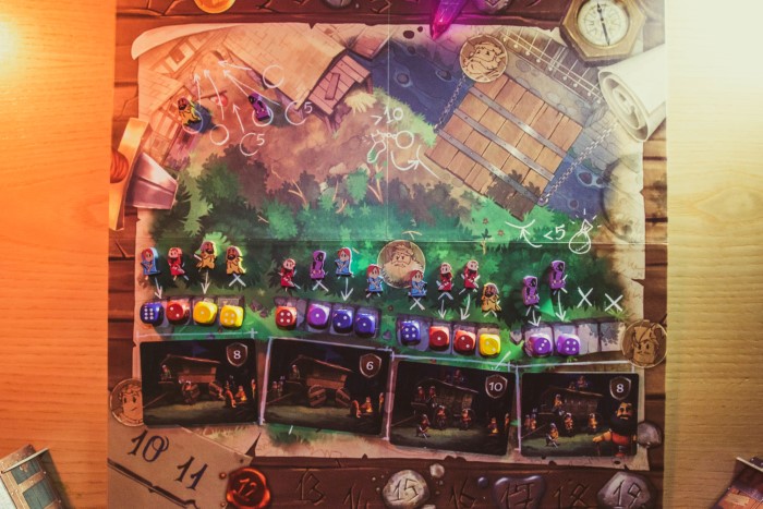 Tutti i dadi ancora presenti sul tabellone saranno posizionati sul ponte levatoio piazzando in colonna tutti i dadi del proprio colore ad esempio: