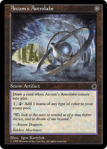 Astrolabio di Arcum è un artefatto molto versatile, che ha trovato molto spazio su più formati. Qualche mese fa è stato bandito in Pauper con l’accusa di aver monopolizzato il formato. Lo stesso discorso vale per il ban in Modern… Gli autori sono felici nel vedere che in Modern sono presenti molti deck che sfruttano meccaniche multicolore, come i 4-Color, ma credono che l’Astrolabio di Arcum faciliti troppo la realizzazione di questi mazzi. Vista la rapidità e la potenza donata da questa carta davvero economica, la Wizards ha deciso di bandirla per riequilibrare il formato. Inoltre, gli autori ci tengono a precisare che stanno tenendo d’occhio l’artefatto anche in Legacy. Tuttavia, nonostante sia molto usato, l’Astrolabio di Arcum non sembra intaccare l’equilibrio degli archetipi che la sfruttano.
