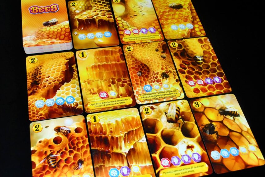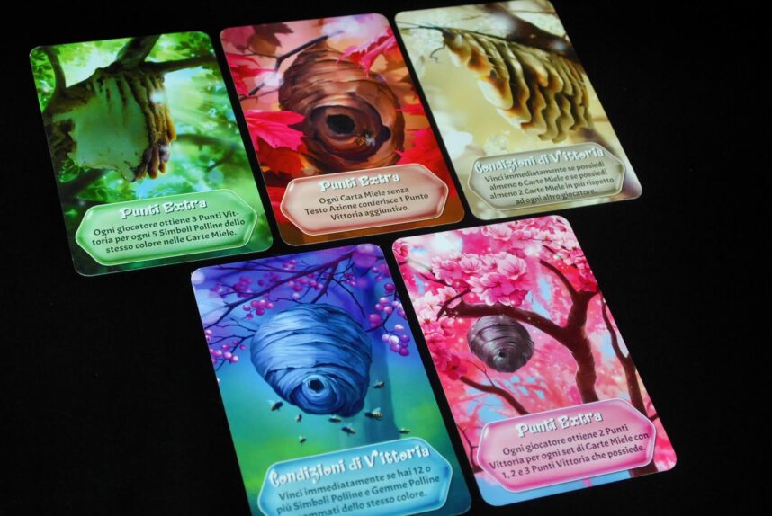 Ad esempio alcune carte daranno dei punti extra per ogni 5 gemme polline dello stesso colore stampate come richiesta sulle nostre carte miele oppure altre ci faranno vincere istantaneamente se avremmo almeno 6 carte miele davanti a noi e almeno 2 in più rispetto a tutti gli altri giocatori.