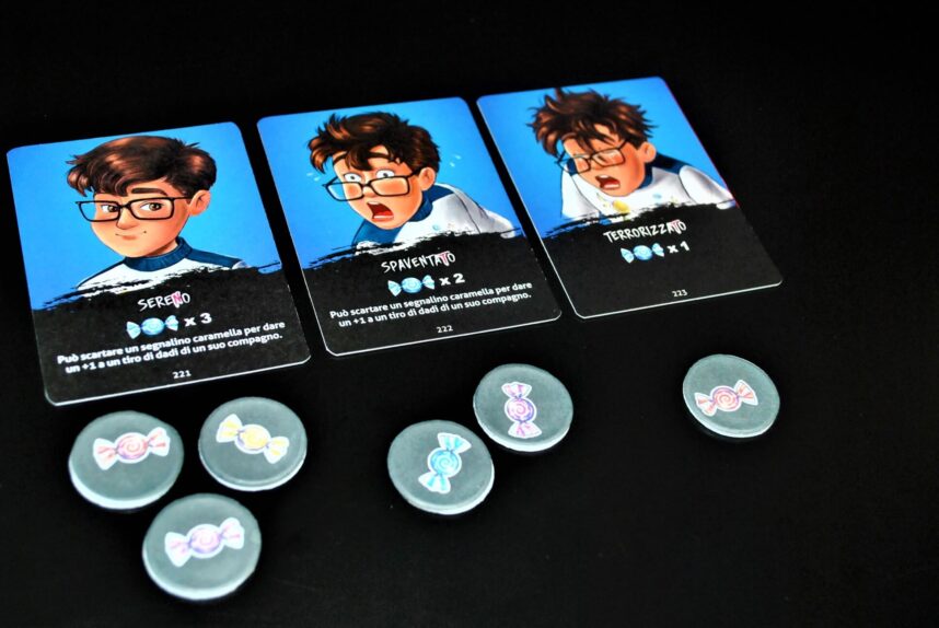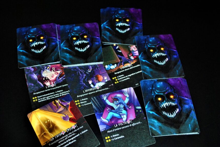 La differenza tra i ruoli di boogeyman e dei bambini è interessante. Costringere l’antagonista a muoversi segretamente (oltre ad essere ben tematizzato) aggiunge uno strato di tensione e tattica niente male, soprattutto per il fatto che una volta giocato il gettone numerato non sarà possibile riusarlo fino a che la scala delle apparizioni non è completa.