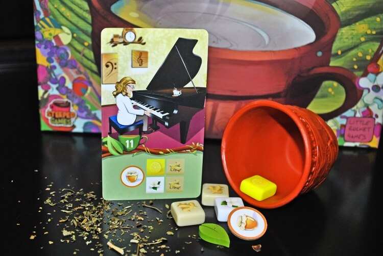 Le carte cliente hanno un colore, che si associa alla tipologia di tè richiesta (oltre che ad un giocatore), indica sulla tazza il numero di punti vittoria che si guadagneranno ed in fondo ci saranno gli aromi e gli eventuali ingredienti della dispensa richiesti.