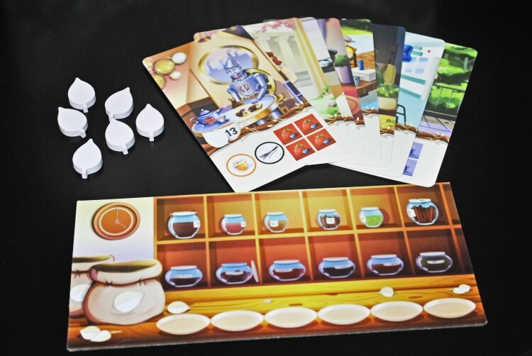 Per prima cosa si dovrà mettere il segnalino di legno del tè associato alla carta, se è di un altro giocatore lo dovrà mettere lui ma noi lo dovremo pagare una moneta di rame per l’acquisto. Poi aggiungeremo gli aromi e/o ingredienti dispensa indicati, prenderemo la carta e la gireremo a faccia in giù accanto a noi ad indicare che è stata risolta e gireremo il gettone mancia della tazza per vedere quanti soldi abbiamo guadagnato con quell’ordine.