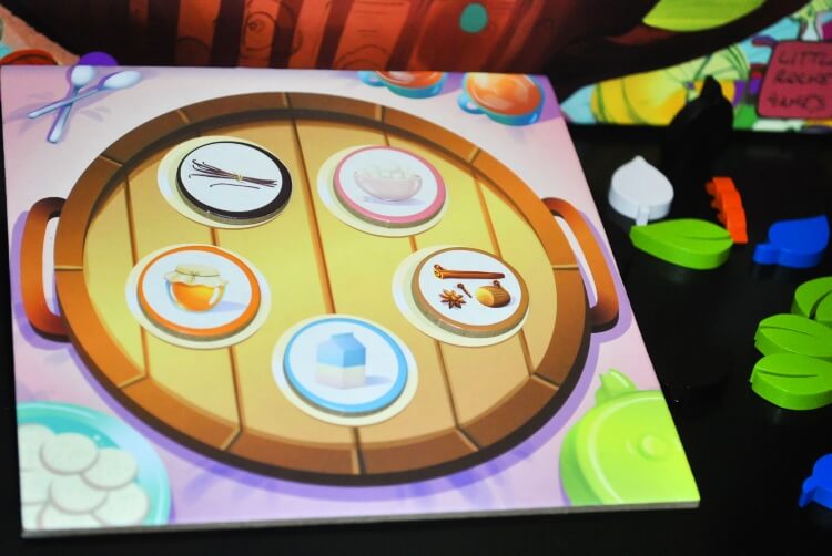 Riempite le 3 righe del mercato con le tessere aroma, mettere un segnalino dispensa per tipo sulla relativa plancia e mescolate le 8 carte abilità svelandone poi 3 al centro del tavolo.