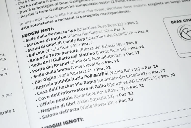 Il racconto inizierà con la presentazione del caso e con la lista di luoghi noti da poter visitare per ispezionarli o interrogare qualcuno.