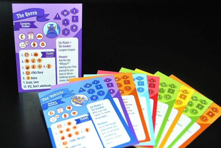 Nei 6 cerchietti invece troviamo una lettera dell’alfabeto (per giochi tipo Kaleidos o Saltinmente), un’ora del giorno con senso orario o antiorario (per decidere quando fare qualcosa e magari il senso del turno di gioco), un simbolo del meteo (per decidere se nel racconto che magari stiamo raccontando stia piovendo a dirotto o magari in cielo c’è un sole che rischiara il cielo), un’emozione con allineamento morale ( per decidere il carattere del nostro personaggio se siamo indecisi), un bersaglio su un pupazzo umanoide (il che può avere molteplici funzioni e scopi come scegliere in maniera randomica dove colpire/ferire l’avversario) ed infine una classe/lavoro riportato anche sullo stendardo sopra ai 6 cerchietti.