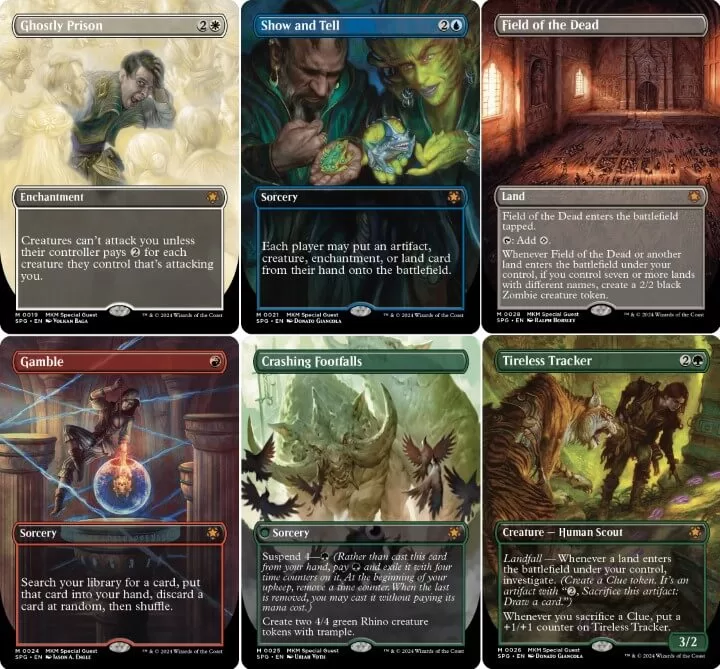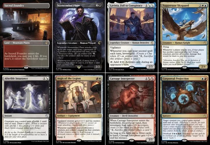 Essendo tutto di proprietà della Hasbro, nasce una collaborazione tra Magic the Gathering e il gioco da tavolo Cluedo che verrà rilasciata il 23 Febbraio 2024. Annesso a Delitti al Maniero Karlov, questa espansione è composta da ristampe e di carte inedite appartenenti alla serie Universi Altrove. Il box di Ravnica: Cluedo Edition è composto da 8 bustine con dentro i deck di gioco precostruiti destinati al gioco multiplayer (vi lascio qui il link delle regole di gioco del Cluedo Edition). Tra le ristampe abbiamo carte del calibro di: Council’s Judgment, Stunt Double, Progenie del Pandemonio, Fulmine, Sussurratore delle Bestie, Colonna di Fuoco, Krasis Idroide, Gran Biomante, Verdetto Supremo, le Bounce Land e le Shock Land. Tra le novità vediamo: