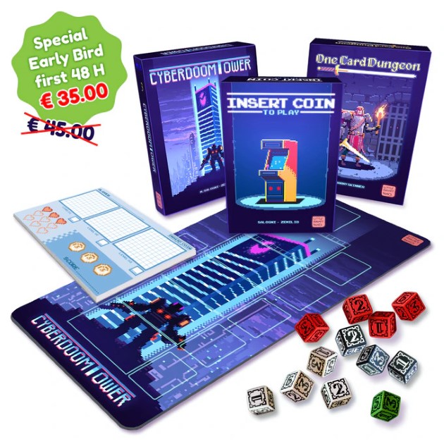 Ben 3 giochi dallo stile pixelart: Insert Coin to Play un party game (2 -6 giocatori) roll and write, Cyberdoom tower un gioco coop per 1-2 giocatori dove dovrai scalare una la torre che da il nome al gioco per fermare una potente AI, e One Card Dungeon che come da nome è un dungeon crawler con meccaniche di piazzamento dadi giocato sun una singola carta!