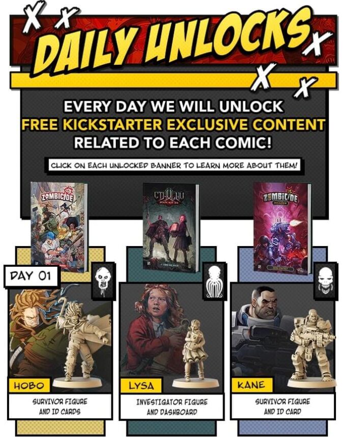 Se sei un amante dei giochi da tavoli CMON pledgia perché: ogni giorno della campagna verrà aggiunto al volume o ai volumi che sceglierai un add-on per il gioco da tavolo relativo, sotto vedete le immagini dei personaggi aggiunti nei primi 3 giorni, miniature (ovviamente!) comprese.