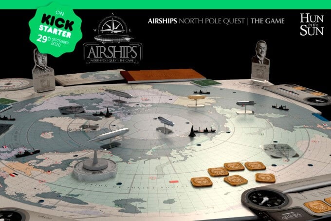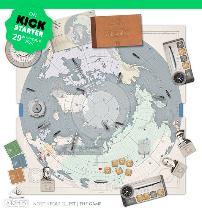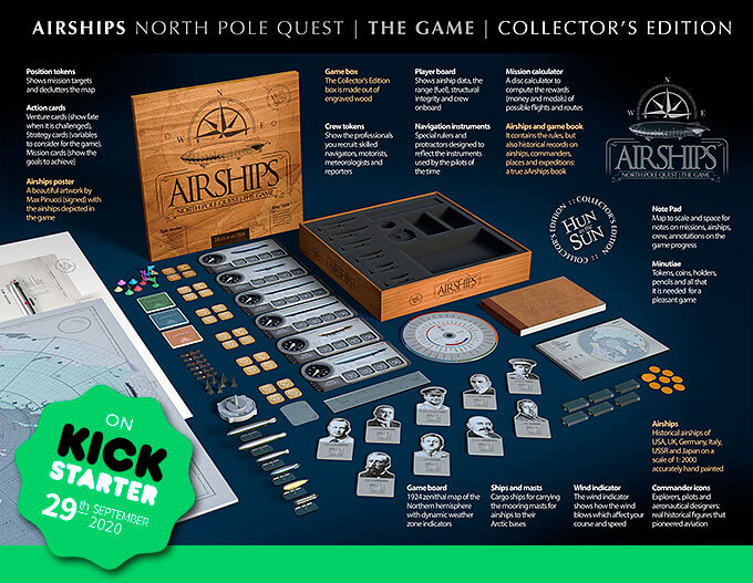 Come dicevo, la stesura del libro “Airships | Designed for Greatness, the Illustrated History” ha richiesto tante competenze che sono dovuto andare a cercare nel mondo, raccogliendo i più grandi esperti internazionali (e non solo storici dell’aeronautica: tra le loro file ci sono appassionati quali Bruce Dickinson, il leader degli Iron Maiden, che ha scritto la prefazione del mio libro). La quantità e qualità del network internazionale di amici, esperti e appassionati, unito al materiale testuale e iconografico raccolto è stato fondamentale per porre le basi del gioco “Airships | North Pole Quest”. Episodi salienti? Beh, uno delle persone che più mi hanno incoraggiato e dato suggerimenti ad esempio è John Stevenson, il regista di Kung Fu Panda (che io adoro). Nel team del gioco ci sono poi progettisti e operatori di reali dirigibili (entrambi grandi appassionati di giochi da tavolo), come Thibault Proux di Flying Whales o Carl-Oscar Lawaczeck di OceanSky. O Petter Johannsen, pronipote di quel Roald Amundsen che nel 1926, assieme a Umberto Nobile e a Lincoln Ellsworth, sorvolò il Polo Nord con il dirigibile N-1 “Norge”.