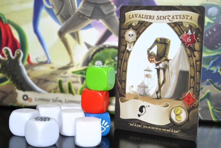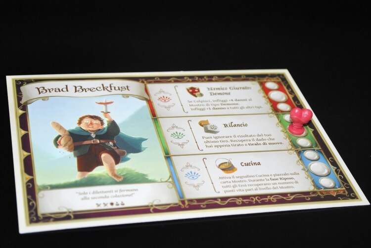Ad esempio in questa foto i punti totali del nostro sono 18, undici indicati dalla carta, più 4 aggiunti dalla carta Dungeon e più tre dati dalla difficoltà difficile scelta ad inizio partita.