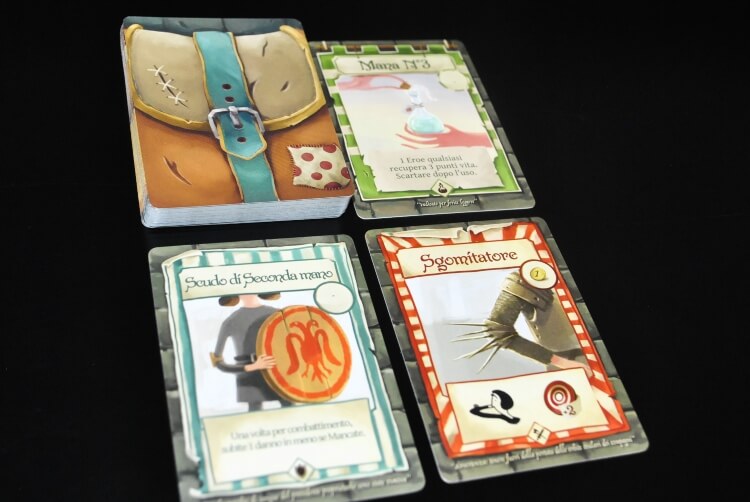 Ogni carta ha un effetto e un costo. Le carte possono essere pozioni (in genere curative o per riattivare dadi), difensive (scudi ed armature) od offensive (armi che aggiungono danni al nostro tiro se lanceremo il dado in un determinato modo, in aggiunta a tutti gli altri indicati dalla carta mostro e/o Dungeon).