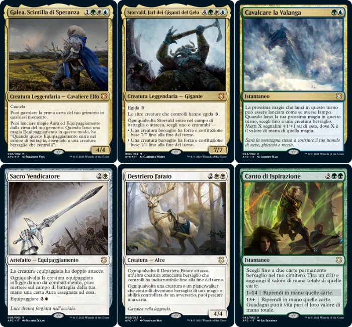 Si può unire l’archetipo Auras ed Equipment in un unico deck? Si, lo hanno fatto! Funziona? Analizziamolo nel dettaglio… Il generale proposto è Galea, Scintilla di Speranza che è perfetto per giocare aure ed equipaggiamenti direttamente dal deck (come se stessimo usando l’incantesimo Visione Futura). Questa leggendaria è davvero una bomba, a quattro mana non è nemmeno malvagia per il Legacy… In ogni caso, questo Midrange punta a potenziare le proprie creature assegnandoli auree ed equipaggiamenti per poi infliggere danni devastanti. Tra le quindici creature abbiamo: creature da aura/equipaggiamento (tra le migliori vediamo Paladino di Acciaio Puro, Sram, Edificatore Capo e Catti-brie di Mithral Hall), creature aggressive enormi (come Storvald, Jarl dei Giganti del Gelo, Sfinge Profetica e Leone Vellocriniera) e utilità di sorta (Angelo dell’Ineluttabilità, Melma Acida, Cavaliera dell’Autunno, Destriero Fatato, Golem d’Argilla, Selkie dagli Occhi di Ghiaccio e Gigante del Mantoreame // Gettare Via). Ma i veri protagonisti sono le auree e gli equipaggiamenti! Tra le migliori possiamo vedere: Armatura di Argentum (ottimo per potenziare in Commander), Collare del Basilisco (un cult per rendere le creature molto potenti), Maglio del Behemoth (versione equipaggiamento del Mantello di Armadillo), Martello del Colosso (da equipaggiare gratuitamente con il generale del deck), Capolavoro di Ingegno (ottimo per copiare un artefatto), Lancia di Selenargento (spedinatore di angeli), Spada dell’Animista (per tutorare terre base), Stivali Piedelesto (per proteggere il generale, un classico del formato), Stivali Alati (anche questo molto buono per proteggere il generare), Cintura della Forza dei Giganti (per rendere la creatura devastante), Sacro Vendicatore (perfetta nel deck per giocare auree, farà molta strada nel formato), Tunica delle Stelle (ottimo artefatto difensivo per il comandante), Spada delle Ore (per raddoppiare i segnalini), Imprigionare nella Luna, Trasformazione di Kenrith (due auree removal), Rancore (aura cult per aggredire) e Manto degli Antichi (devastante per riprendersi da un removal). Tra le altre magie, vediamo: Anello Solare, Sapere della Natura, Tempesta Cerebrale, Visioni del Siero, Venti di Rath (removal che salva le creature incantate), Impresa Valorosa (un mass removal spedinatore, l’effetto randomico viene non è fastidioso per il Commander), Enigma-Interdizione di Netheril (buon incantesimo che interagisce con i dadi), Portento del Divinatore (versione alternativa di Geyser Mentale), Canto di Ispirazione (molto buono per recuperare carte ed eventualmente guadagnare punti vita) e Cavalcare la Valanga (un portento per lanciare le magie con sorpresa, sono dell’idea che tornerà molto utile in competitivo). Il comparto terre è basilare, ma sono presenti ottime carte per iniziare. Ritornando alla domanda iniziale: questo deck funziona? Si, ma non questa versione! O per meglio dire: questo deck Bant è un valido inizio per questo archetipo, ma esistono una marea di magie da inserire per potenziarlo. Personalmente abbasserei il numero di creature, per abbondare di equipaggiamenti, auree e carte devastanti come: Diadema dell’Alba, Nemesi del Vero Nome, Slealtà, Jitte di Umezawa, Halvar, Dio della Battaglia // Spada dei Reami e via dicendo. L’accoppiata Bant genera belle interazioni, ma volendo lo si può sostituendo il verde con il rosso (è un’idea da testare). Lo consiglio come base per testare qualcosa che potenzialmente può diventare devastante. Giocatori competitivi siete avvisati!
