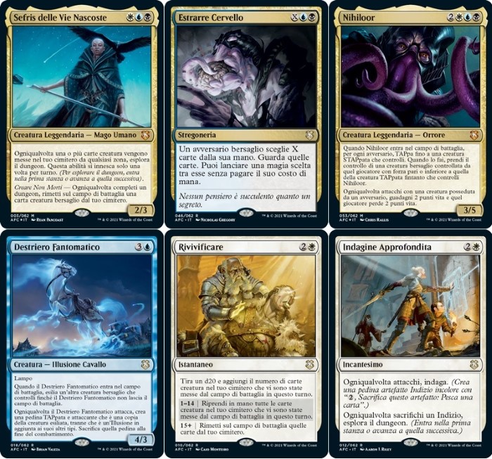 Questo deck è un Dungeon Esper (colori bianco, blu e nero) con tendenze Control e Reanimator. Il simbolo del deck è il comandante proposto Sefris delle Vie Nascoste, che permette di esplorare quando si perde una carta e rianima costantemente. Le creature si dividono principalmente in tre macro categorie: creaturoni da rianimare (come Cavalcatrice Cinerea, Meccatitano del Cataclisma, Campionessa d’Ingegno, Drago Eterno, Solar Radioso e Angelo dell’Esplosione Solare), creature per rianimare (come Titano Solare, Guida del Karma e Negromante Condannato) e creature di varia utilità (come Strige Funesto, Simulacro Solenne, Immagine Fantasma, Nihiloor, Hama Pashar, Cercatrice di Rovine, Destriero Fantomatico, Sovrintendente dei Misteri, Sequestratrice di Ostaggi e Fauce Urlante). Il resto delle magie è composto da magie di controllo e di utilità, tra le migliori vediamo: Anello Solare, Propaganda (un classico per ritardare gli attacchi nemici), Fine Assoluta, Da Spade a Spighe!, Descintillazione, Selezione Necromantica (il removal del deck), Vessare, Rituali di Esumazione, Impresa Sepolta, Rivivificare (i reanimator del deck), Mappa del Dungeon (per esplorare costantemente), Schinieri dei Fulmini (un classico per proteggere il comandante), Indagine Approfondita (ottima interazione tra Investigare ed Esplora il Dungeon, peccato che non sia legale in Standard), Impresa Arcana (magia randomica, ma permette di giocare una magia gratuitamente), Estrarre Cervello (molto buona per rubare magie, potrebbe trovare spazio anche in Legacy in qualche Dimir Control), Bacchetta di Orcus (buon equipaggiamento che spedina zombie), Verga Inamovibile (buon equipaggiamento da controllo per gli archetipi Dungeon) e Verga dell’Assorbimento (ottima per rilanciare le magie di massa, tornerà utile in molti deck di Commander). Il comparto terre è anche qui basilare, ma torna utile per iniziare a giocare… Inoltre, ci sono carte come Mercato Principale e Manicomio delle Alture Geier che tornano utili per attivare le combo da reanimator. Questo deck è un classico del controllo, ma sfrutta molto bene le nuove meccaniche proposte. Questo è sicuramente il miglior deck dell’offerta, lo consiglio vivamente ai giocatori competitivi. Anche qui c’è un’altissima possibilità di modifica: se le meccaniche Dugenon non piacciono si può optare per un Reanimator classico, aumentano i reanimator (come Animare i Morti e Rianimare) o altri creaturoni da devastazione (come Arconte della Crudeltà e Titano Sepolcrale).