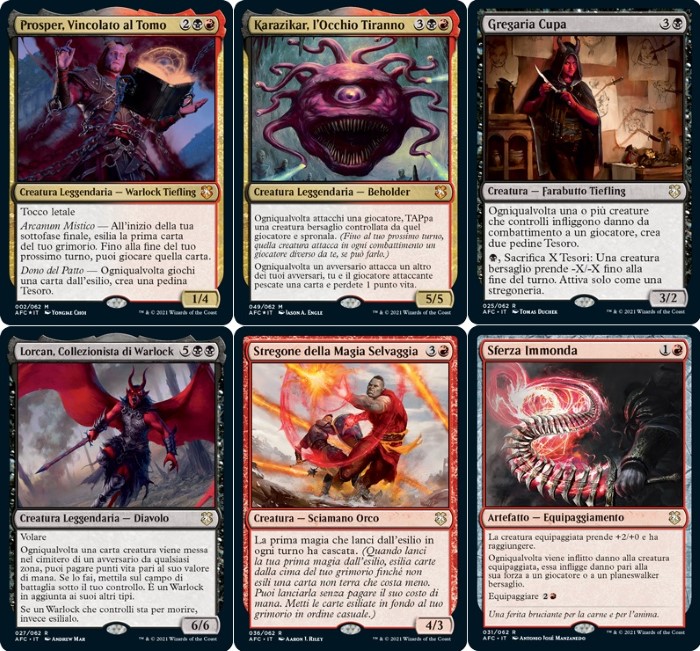 Vediamo un Exile Deck dei colori Rakdos (rosso e nero) che sfrutta anche le meccaniche: Cascade, Treasure e Suicide. Prosper, Vincolato al Tomo è il sunto di queste meccaniche: perché permette di giocare la magia esiliata e generare tesori. Le venti creature si dividono prevalentemente in: spedinatori (come Pifferaio della Colonia, Ogre Padrone dei Tuguri, Strega Squittente, Apprendista Fedele, Maestra Burattinaia e Tiranno della Morte), creature exile (come Incanalatore del Caos, Oracolo Abitante dell’Oscurità, Predasogni, Immonda delle Ombre, Gonti, Signore del Lusso, Etali, Tempesta Primordiale e Chimimago Izzet) e utilità di sorta (come Spericolata della Flotta Funesta, Gigante Tettonico, Pontefice della Rovina, Lorcan, Collezionista di Warlock, Gregaria Cupa, Stregone della Magia Selvaggia e Karazikar, l’Occhio Tiranno). Per il resto delle magie, vediamo: magie exile e caotiche (come Comunione con la Lava, Sospetto Febbrile, Apice del Potere, Infiammare il Futuro, Illuminare la Scena, Condividere il Bottino, In Preda al Caos, Teatro degli Orrori e Bacchetta del Caos), removal (come Distorsione Caotica, Tormento Diabolico, Esplosione di Bitume, Terminare, Trovate dei Prigionieri, Talismano Rakdos, Vapori Distruttivi, Impresa Avventata, Trasgredire al Galateo, Anatema, Tisi, Esplosione Vandalica, Scagliare all’Inferno e Obelisco Instabile) e utilità (come Anello Solare, Pietra della Mente, Cassa del Morto, Classe del Warlock, Danza Macabra, Intimorire Infernale, Sferza Immonda, Borsa Sempre Piena di Bucknard e Borsa Divorante). Il comparto terre è anche qui basilare, ma è un buon punto di partenza. Questo è un deck davvero interessante, perché è una rappresenta tutto quello che può fare l’accoppiata Rakdos. Il deck può essere modificato in svariati modi, puntando ad una meccanica piuttosto di altri. Magari con puntando più ai Treasure con Celebrare la Ricchezza oppure splashare il deck per puntare ad un Cascade completo. Questo è un deck che consiglio ai giocatori navigati che riescono a comprendere tutte le folli meccaniche proposte.