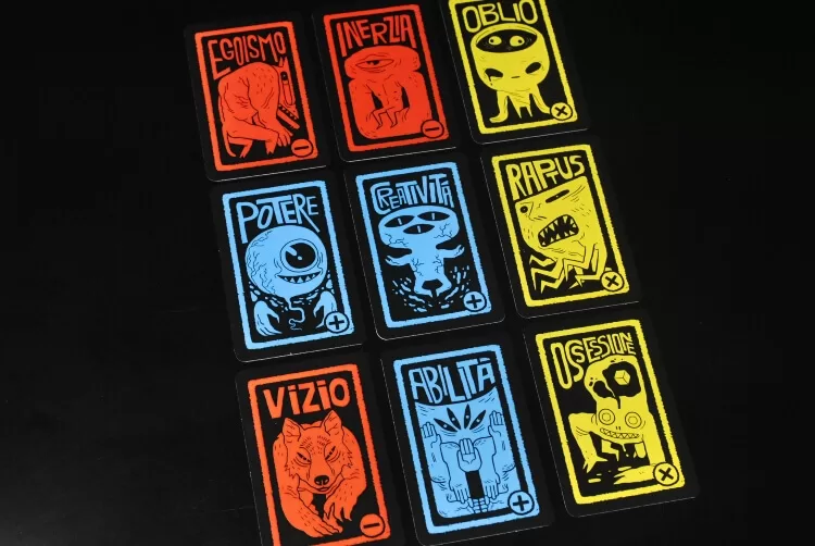 I giocatori poi, in base alla loro inclinazione, prenderanno le carte entità che li identificheranno. 2 Rosse e una gialla per i malvagi, 2 Blu e una Gialla per i buoni e una per ciascuno dei tre colori per i giocatori caotici.