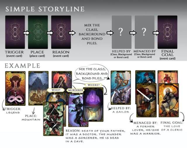 Il progetto prevede anche una funzione aggiuntiva, ovvero la creazione di una storyline: attraverso l’utilizzo di 3 carte evento, una carta luogo e 2 carte classe, è possibile creare un sequenza di avvenimenti, che porta all’innesco di una trama e ad un possibile risultato.