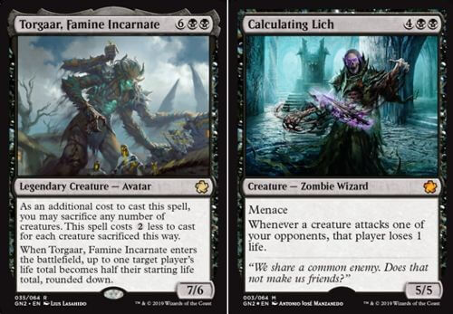 Endless Hordes è un deck mono nero Midrange, che sfrutta anche meccaniche: Aggro, Reanimator, Suicide e Tribal Zombie. Tra le creature degne di nota, vi segnalo: Signora dei Maledetti (che potenzia l’orda di zombie che sconfiggerà l’avversario), Scavatombe (per recuperare creature al cimitero), Vilis, Intermediario di Sangue (per rimuovere le piccole creature e pescare), Presenza Terrificante (la versatilità nei mono nero) e Torgaar, Incarnazione della Carestia (una macchina da guerra nei deck Suicide). La creatura esclusiva del deck è Calculating Lich: uno zombie abbastanza grande, con ottima meccanica pain per gli avversari. Il resto delle magie è composto da: removal (come Omicidio) e reanimator (come Risuscitare). Faccio una menzione speciale per Maestria di Liliana, che torna utile per potenziare lo Zombie Tribal.