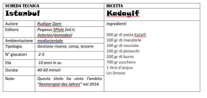 Per la nostra rubrica che abbina gioco e cucina, cercheremo il giusto partner culinario per il gioco da tavolo Istanbul vincitore del prestigioso premio “Kennerspiel des Jahres” nel 2014