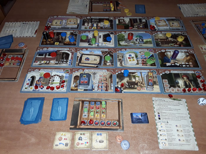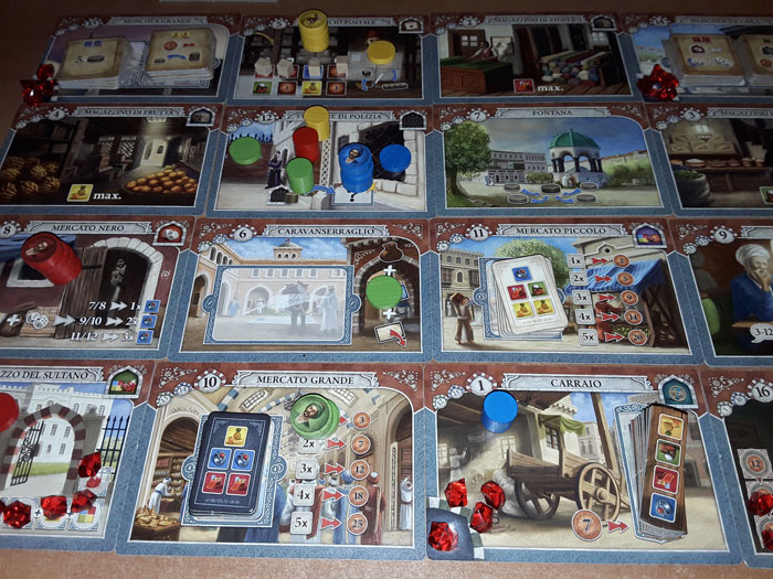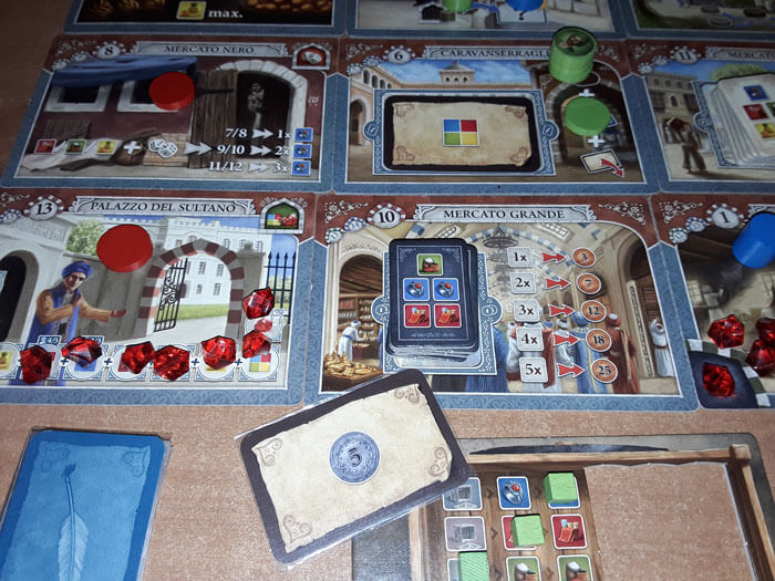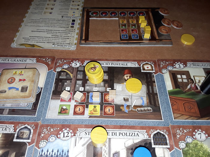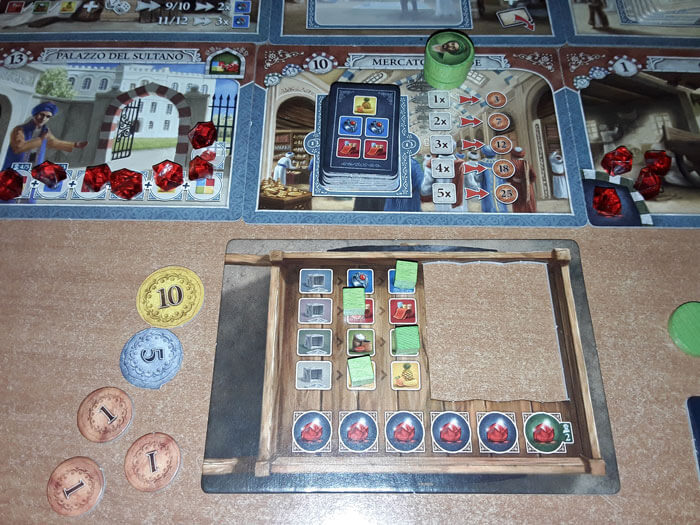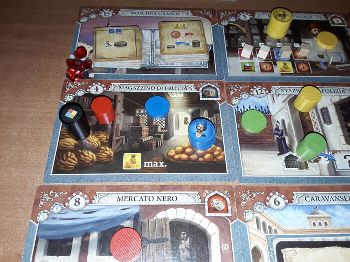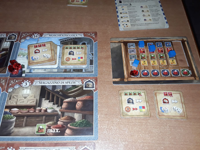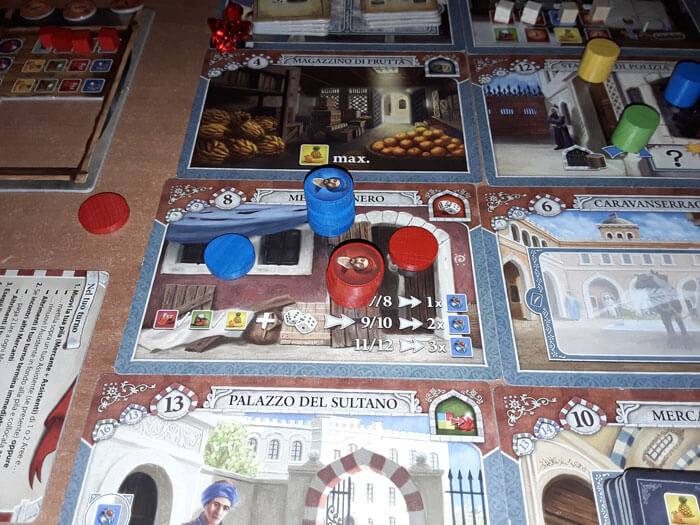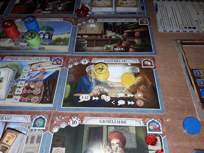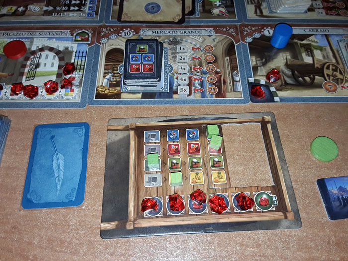 Ad esempio, se arriva su una Tessera “Magazzino” (Stoffa, Spezie, Frutta), deve spostare l’indicatore della Merce corrispondente (rosso, verde, giallo) nella casella più a destra possibile. In questo modo, guadagna tante merci di quel tipo pari al numero di caselle sulla stessa linea; che potrà sfruttare in seguito per le prossime azioni.