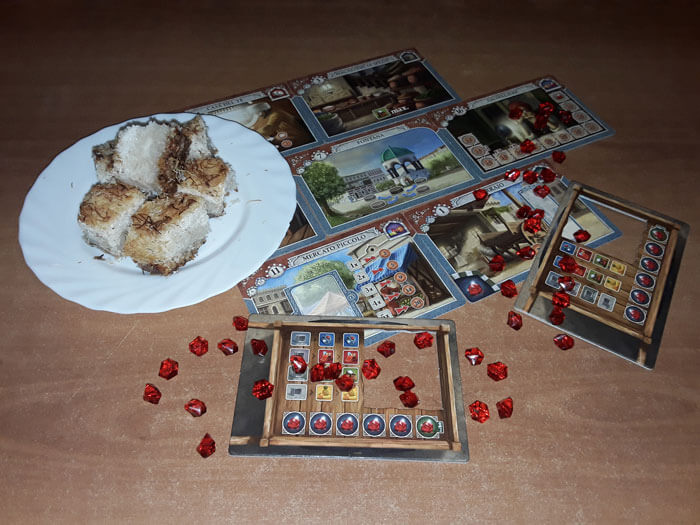 Un pezzetto di questo golosissimo dolce vi aiuterà a calarvi meglio nei panni del mercante, in cerca di merci preziose tra le bancarelle di Istanbul; oltre che essere una buona fonte d’energia da sfruttare per trovare la strategia più veloce per raggiungere le tanto agognate Gemme. Ma attenzione: il dolce è molto appiccicoso e si consiglia l’uso di tovaglioli o salviette per evitare di sporcare pedine e carte!