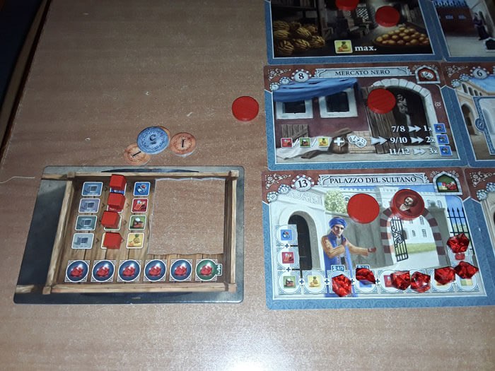 Il giocatore rosso raggiunge il Palazzo del Sultano: se volesse, potrebbe prendere la prima Gemma sul tracciato, pagando una merce di ciascun colore.