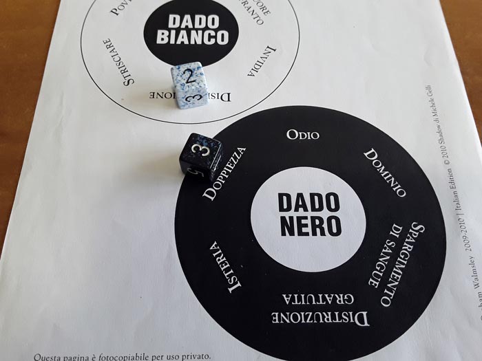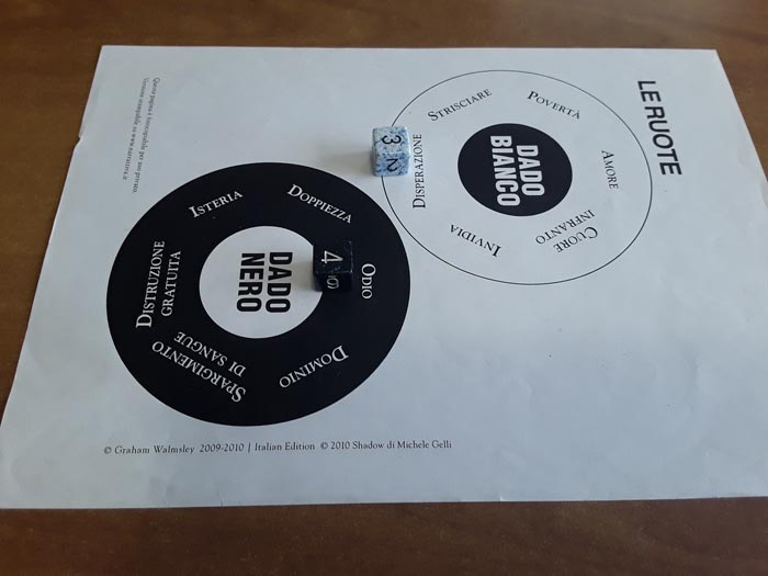 Le due Ruote dei Dadi Speciali, con il dado Bianco su “disperazione” e quello Nero su “odio”. La cuoca MariaRosaria riesce ad interpretare il sentimento d’odio che ha nei confronti del figlio del padrone: i giocatori la ricompensano con il dado Nero.