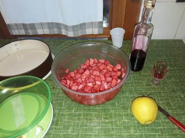 Le mele sono state sbucciate e fatte a pezzetti: ora le bagnate con l’alchermes ed il limone e lasciatele riposare.
