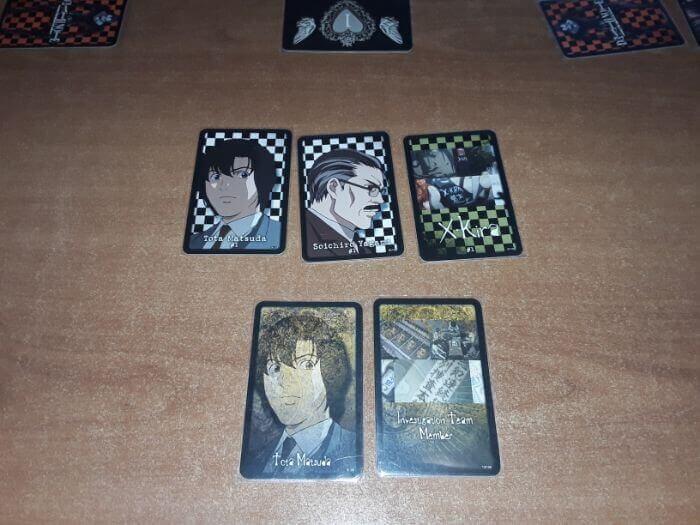 Fase Indagine nella modalità Kira: il giocatore gioca tre carte – due Identità e un Ruolo – rivelando che almeno una di queste è quella che possiede (in questo caso l’Identità).