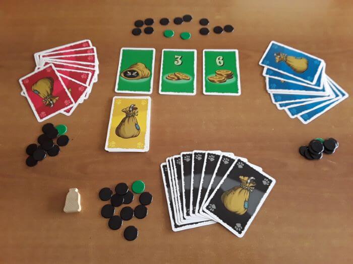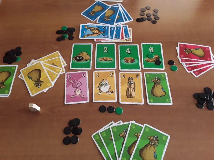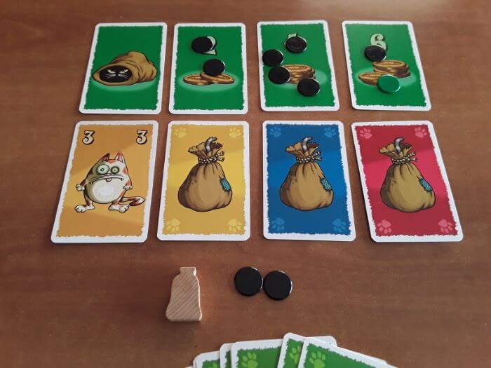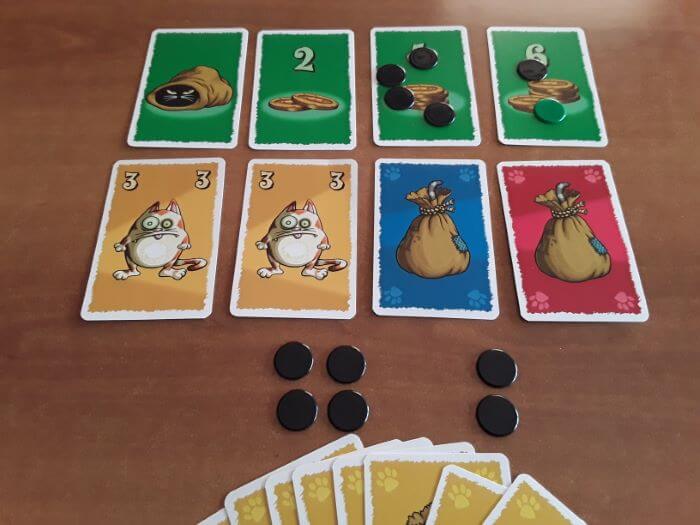 La partita si svolge in 9 round – uno per ogni carta che ha in mano ciascun giocatore – dove i giocatori si contengono i gatti nel Sacco tramite un’asta.