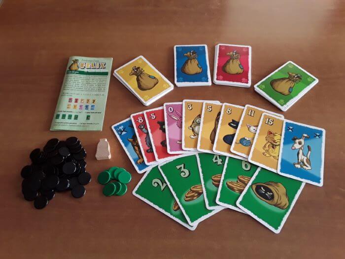 La scatola di Felix: Il Gatto nel Sacco è piccola, ma sufficiente per tenervi dentro tutto l’occorrente per giocare: 50 carte (tra carte Gatto, Coniglio e Cane grande e piccolo); 4 carte Topo monete (dal valore 2,3,4,6), la carta “Gatto nel Sacco”, 76 Topo-monete (68 gettoni neri e 8 gettoni verdi) e il segnalino Sacco (in legno) per il primo giocatore.