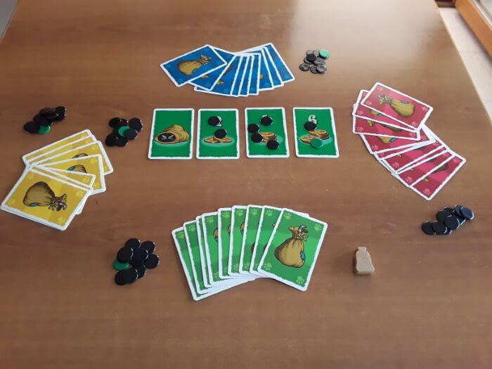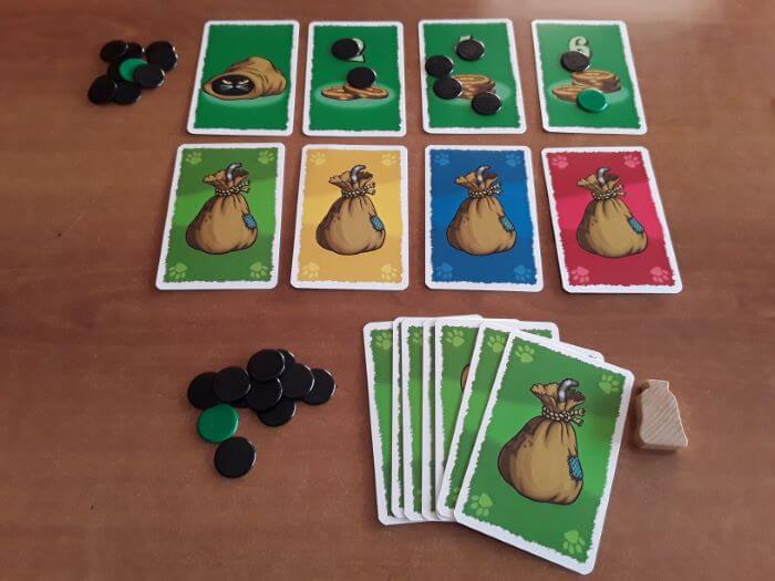 Il giocatore verde – dopo aver rivelato la prima carta del Sacco – decide di puntare due Topo-monete per accaparrarsi il Sacco.