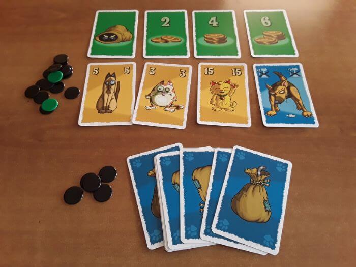 Prima di cominciare con l’asta, bisogna vedere quali gatti saranno nel “Sacco”: partendo dal primo giocatore, ognuno colloca una delle proprie carte in mano coperta, al di sotto della fila delle carte Topo-monete. Quindi, il primo giocatore colloca la propria carta al di sotto della carta “Gatto nel Sacco”, il secondo giocatore gioca la sua carta accanto a quest’ultima e così via.