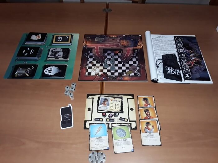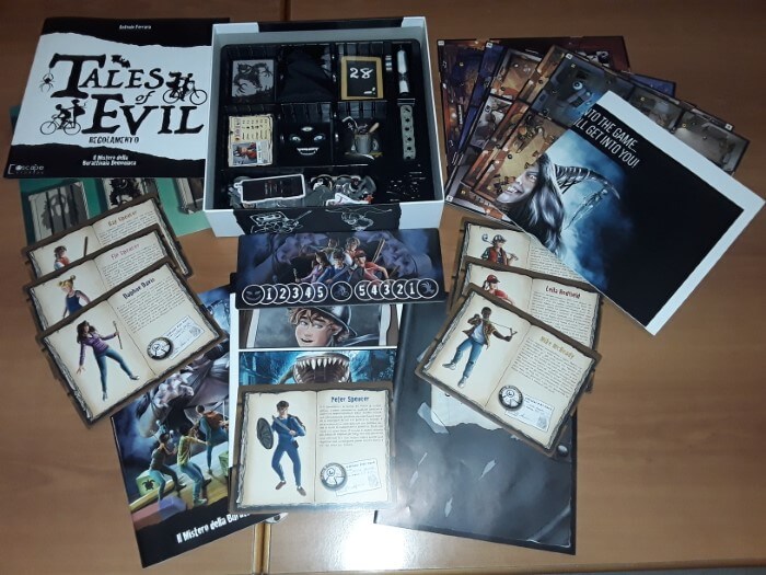 La scatola di Tales of Evil è piena stracolma di componenti – infatti la scatola pesa parecchio! – ma grazie ad un organizer davvero ben pensato, riuscirete a non confonderli troppo. Quindi, all’interno troverete diversi fascicoli (Regolamento, Libro della Storia, Libro degli Eventi, Libro “Il Ragazzo Disperso e Altre Storie), 5 Dadi, 6 Plance, 7 Schede Investigatore (con altrettante Sagome Personaggio, Basi), una Plancia degli Avvenimenti, 216 Carte e più di 150 Segnalini di vario genere (tra cui Segnalini Corpo, Mente e Spavento).