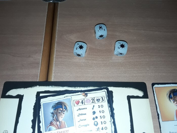 Tuttavia, anche la creatura potrebbe attaccare a sua volta: in tal caso, il giocatore lancia tanti dadi pari al valore su “Difesa” – sempre sulla carta Status – più dadi aggiuntivi da carte Ritrovamento/Equipaggiamento. Ogni risultato “Centro” permette di ridurre di 1 il numero di danno che tale giocatore subirebbe; perdendo invece un segnalino Cuore per ogni danno che non riesce a respingere.