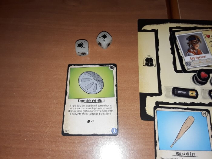 Esempio: un losco individuo prova ad attaccare il nostro Ray e gli potrebbe infliggere due danni. Il giocatore lancia due dadi (uno per la Difesa ed uno aggiuntivo grazie al Coperchio dei Rifiuti) ed ottiene un Successo, subendo un solo danno.