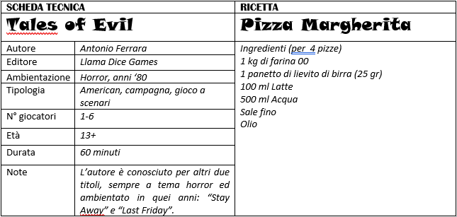Il nostro Andrea ha preso alla lettera “Pizza & Investigation” per cui oggi ci parlerà di Tales of Evil di Antonio Ferrara, abbinandoci la ricetta della pizza 😉