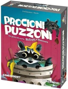 Procioni Puzzoni è un divertente gioco di carte, dadi e fortuna. Ruba i rifiuti degli altri procioni, imboscateli e riscuoti più punti col tuo bottino puzzolente! Tira il dado per ottenere azioni che ci permettono di raccogliere e rubare carte spazzatura da nascondere nella propria riserva. Tirare e ottenere due volte lo stesso risultato però ci farà perdere tutte le azioni del turno. Ogni carta spazzatura può essere imboscata per guadagnare punti, oppure usata per un effetto speciale, per raccogliere più spazzatura o intralciare gli avversari.