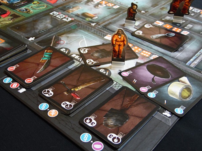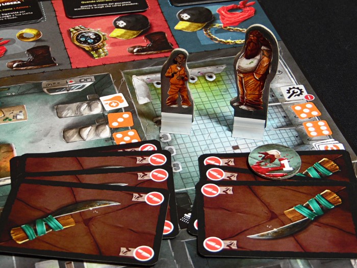 Prepariamo l’area di gioco organizzando le carte, per prima cosa raggruppiamo le carte coltello, piccone, pala e cucchiaio in quattro mazzi. Dobbiamo arrangiarci con ciò che c’è e questi sono gli strumenti con cui cercheremo di crearci la via di fuga, i primi tre vanno posizionati negli appositi spazi accanto all’area ricreativa del cortile, mentre i cucchiai nell’area mensa.