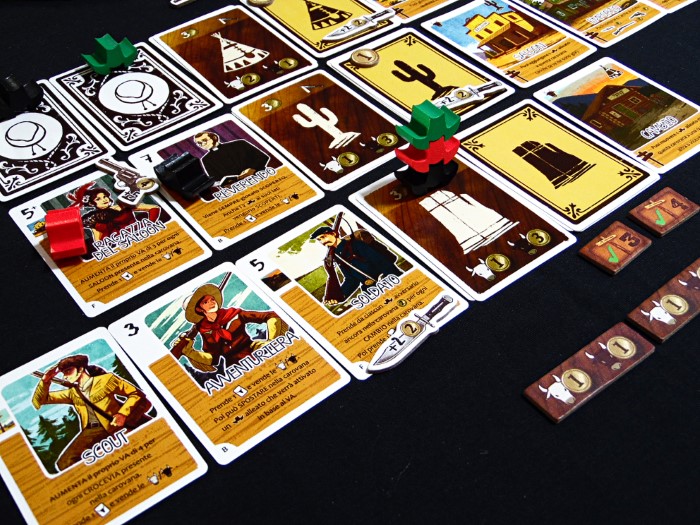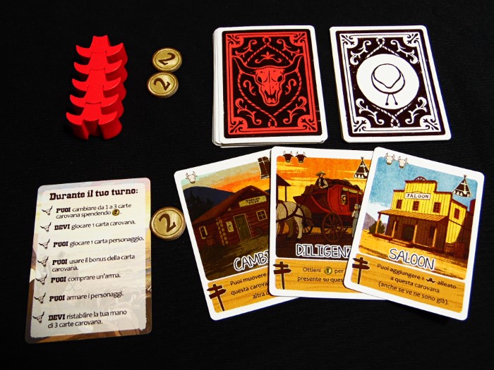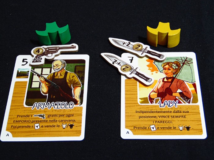 Se si vuole, in aggiunta, possiamo giocare un personaggio, ma solo se in quella carovana non ne abbiamo altri. Questi vanno piazzati a faccia in giù nella parte sinistra e contrassegnati con uno dei nostri cappelli per riconoscerli. Dovremo essere abili e mantenere una faccia da poker in questa fase, per non rivelare le nostre intenzioni e strategie.