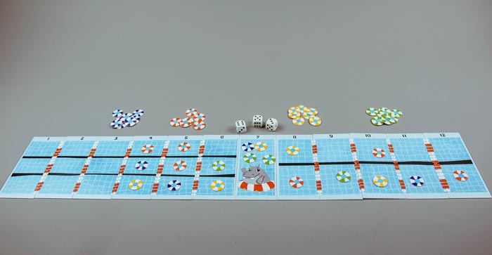 Si posiziona al centro del tavolo il tabellone di gioco componibile dalle 12 tessere che formano una piscina per metà a 3 corsie e per la seconda metà a 2 corsie, la vasca numero 7 è occupata da Hippo, che è la vasca per i bimbi. Lo scopo della vasca 7 funziona come da “Jolly” ovvero che le pedine che saranno posizionate in quella vasca non potranno essere eliminate perché Hippo le conserverà per voi.