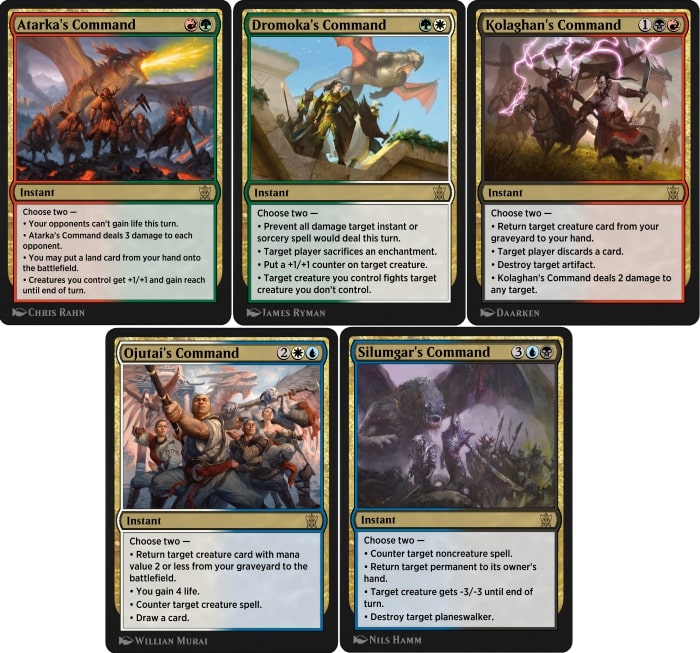 - Iniziamo con la sorpresa più eclatante dell’offerta! Nell’Historic entrano in scena i cinque “Comandi Bicolori” rilasciati nell’espansione Draghi di Tarkir. Queste magie versatili completano il ciclo proposto in Strixhaven: Scuola dei Maghi, le carte in questione sono le seguenti: Comando di Atarka (perfetta magia da supporto negli Aggro, specialmente negli archetipi Gruul), Comando di Dromoka (buona magia di supporto per gli Stompy), Comando di Kolaghan (il miglior comando di questo ciclo, considerata una delle magie versatili più potenti e giocate degli ultimi anni! Verrà giocata in molti Control e Midrange, in particolare nei vari Suicide Rakdos che dominano il formato… Eccezionale!), Comando di Ojutai (versione depotenziata della versatile Ordine Criptico, tornerà utile nei Control del formato) e Comando di Silumgar (anche questa tornerà utile nei Control del formato, in particolare dei Dimir e Grixis). L’Historic guadagna delle ottime carte, dovete assolutamente recuperarle;