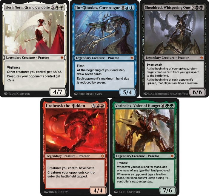 - Un’altra sorpresa sono è il ciclo di cinque pretori apparsi in Nuova Phyrexia. Le carte in questione sono: Elesh Norn, Grande Cenobita (la più potente di questo ciclo di leggendarie, perfetta nei Control per depotenziare le creature avversarie. Verrà molto giocata negli Esper e negli Azorius Control), Jin-Gitaxias, Augure del Nucleo (pesantissimo, ma eccezionale nei Control. Gli archetipi Sultai lo possono giocare in combo con Ultimatum Inatteso), Sheoldred, La Bisbigliante (viene rimediata l’assenza nello scorso Jumpstart, vediamo un’enorme reanimator per gli archetipi Control Grixis e Control Dimir), Urabrask il Nascosto (in Modern sta tornando utile nell’archetipo Electro-End, si potrebbe riproporre una versione alternativa anche in Historic… Bisognerebbe trovare un’alternativa a Fine Vivente) e Vorinclex, Voce della Fame (bestione da giocare nei Green Ramp e nei Simic Ramp, torna utile anche per controllare). Nonostante siano molto pesanti, torneranno molto utili per potenziare molti deck del formato… Si possono giocare anche in mono-copia. Piccola chicca: saranno disponibili anche in lingua phyrexiana;