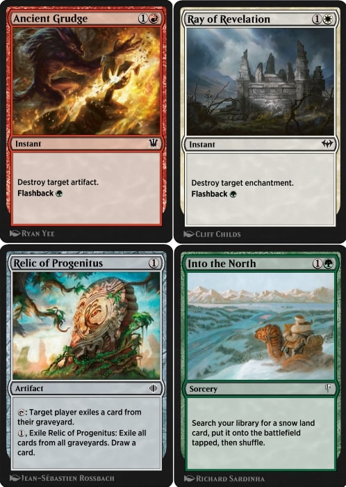 - Antico Rancore e Raggio della Rivelazione: ottime carte da sideboard contro artefatti ed incantesimi, torneranno molto utili con tutte le carte che interagiscono con i cimiteri. Sono essenziali nel formato;