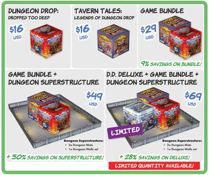 In questo secondo KS troviamo: l’espansione Dropped Too Deep che aggiunge nuovi mostri nuovi, cubi e nuove regole oltre a Tavern Tales il gioco stand alone di carte basato su meccaniche di set collection che ci ripropone i mostri conosciuti nel gioco originale.