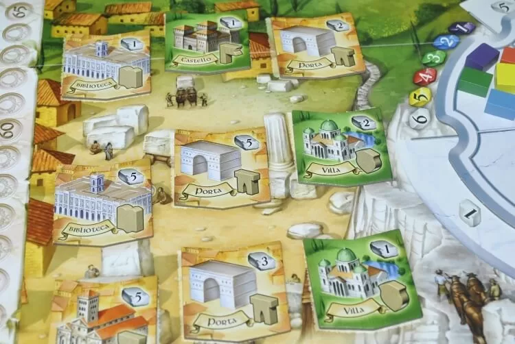 Quando costruiremo un monumento, potremo prendere anche una delle tessere miglioria tra quelle disponibili, tessere che ci aumenteranno le rendite delle città. Rendite che potranno essere in punti vittoria o monete come vedremo più avanti.