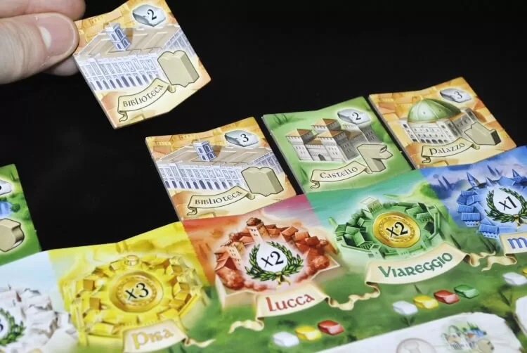 In questo esempio si sta costruendo la biblioteca a Lucca. Il costo è di 2 blocchi e i colori che si possono spendere sono bianco, giallo e rosso.
