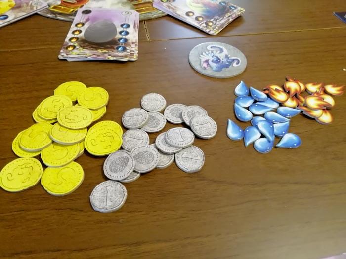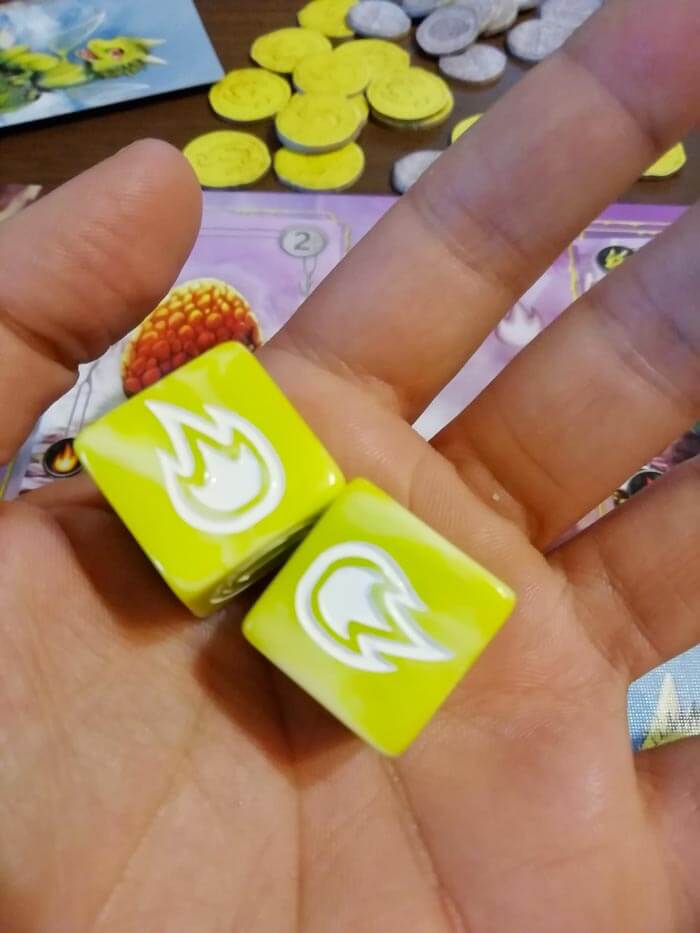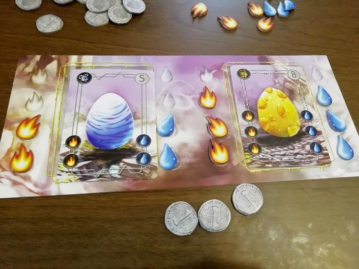 Le facce dei dadi che raffigurano: la moneta, il fuoco e l’acqua consentono di prendere uno dei segnalini corrispondenti al risultato dalla riserva. Se invece il giocatore realizza una coppia di simboli uguali ne prende ben tre di questi segnalini. I segnalini acqua e fuoco sono “le energie” che servono a far schiudere le uova di drago: dobbiamo piazzarle nei rispettivi slot della plancia incubatrice, ma solo se sono presenti carte uovo. Se non riusciamo a posizionarle o se sono in eccesso, vengono piazzate sulla plancia mercato.
