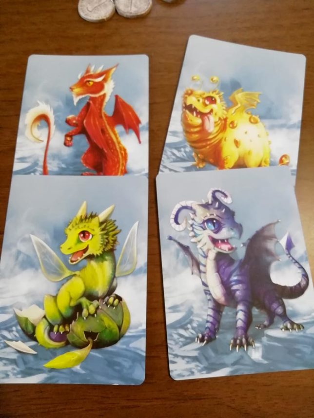 Sulle carte uovo di drago sono presenti: un costo in risorse per farle schiudere, il valore in punti vittoria e un simbolo che mostra il tipo di draghetto.
