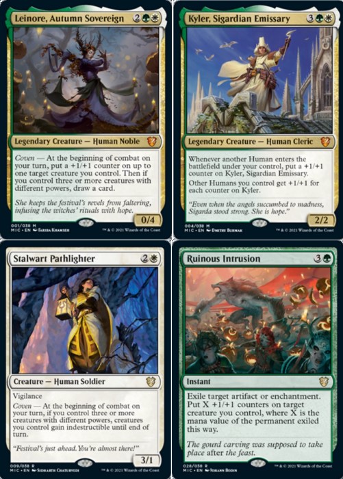 Questo mazzo Selesnya (colori bianco e verde) è un deck Stompy che sfrutta le meccaniche: Token, Counter +1/+1 e Tribal Human. Il deck sfrutta anche la meccanica Congrega, effettivamente la sintesi dell’offerta è il comandante proposto Leinore, Autumn Sovereign: oltre a potenziare il nostro esercito, torna utile per pescare. Il cuore del deck sono le creature, divise per categoria, vediamo: motori di mana (Pellegrino di Avacyn, Anziano di Yavimaya, Saggia di Somberwald, Saggia del Cerchio e Cavaliere dell’Orchidea Bianca), carte che potenziano lo Human Tribal (Kyler, Sigardian Emissary, Heronblade Elite, Cari Estinti, Messaggera di Guerra, Cavalieri di Gavony, Campione della Grazia dell’Airone e Sigarda, Grazia dell’Airone), carte che interagiscono con i segnalini +1/+1 (Kurbis, Harvest Celebrant, Custodi Soulbinders, Mikaeus, il Lunarca, Inviata della Vittoria, Campionessa di Lambholt, Meccatitano Rigoglioso, Ainok Fratello d’Onore, Falconiere Abzan, Guardia Scaglia d’Élite, Fautrice Orzhov, Ranger dell’Ordine di Juniper e Signore della Scaglia Perpetua), spedinatrici (Evocatrice di Trostani, Somberwald Beastmaster e Spezzagabbie di Kessig) e utilità di sorta (Testimone Eterna, Odric, Grande Stratega, Domatrice Selvaggia, Protettrice del Baluardo, Sigardian Zealot, Guardiane Albacorno, Wall of Mourning, Angelo dell’Ascesa della Gloria, Stalwart Pathlighter, Sigarda’s Vanguard e Moorland Rescuer). Per le restanti magie, vediamo: removal (Ruinous Intrusion, Da Spade a Spighe!, Bestia Interiore, Ritornare Polvere, Nova Purificatrice, Celestial Judgment e L’Ora dei Conti), maledizioni (Curse of Conformity e Curse of Clinging Webs), motori di mana (Anello Solare, Chiave di Selenargento, Sigillo Arcano, Talismano dell’Unità, Celebrate the Harvest e Spasmo di Crescita) e utilità di sorta (Bestiario del Forgiavita, Stivali Piedelesto, Formazione Indissolubile, Rivelazione Sciamanica, Assedio della Roccaforte e Presenza della Morte). Il comparto terre è alquanto valido, ci sono ottime Dual Land per poter iniziare a giocare in competitivo. Sostanzialmente è un deck alquanto equilibrato, molto buono per chi vuole iniziare a giocare a Commander. Effettivamente può essere ampliato in molti modi: esistono tante meccaniche che sfruttano i segnalini, altrettanto vale per gli archetipi che sfruttano le pedine o possiamo direzionarlo per lo Human Tribal. A voi la scelta!
